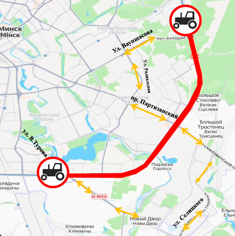 ГАИ предложили для тихоходов альтернативные варианты: автодорога Н-9034 – ул. Селицкого – пр. Партизанский; местный проезд МКАД – ул. Ваупшасова – ул. Радиальная – пр. Партизанский – ул. Кабушкина – ул. Ташкентская – ул. Уборевича.