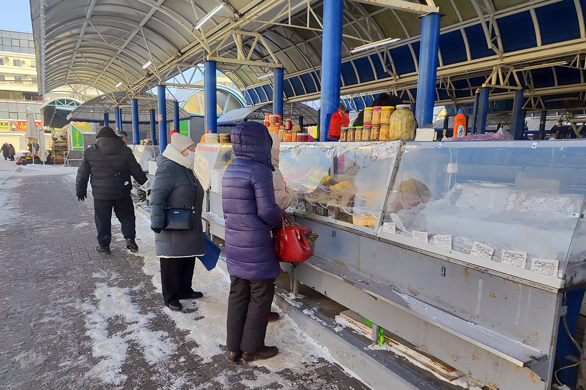 Людей не отпугивает и мороз в -25°C. Они активно закупаются как на крытом рынке, так и на сезонном. Последний, к слову, тоже работает – кое-что да продают.