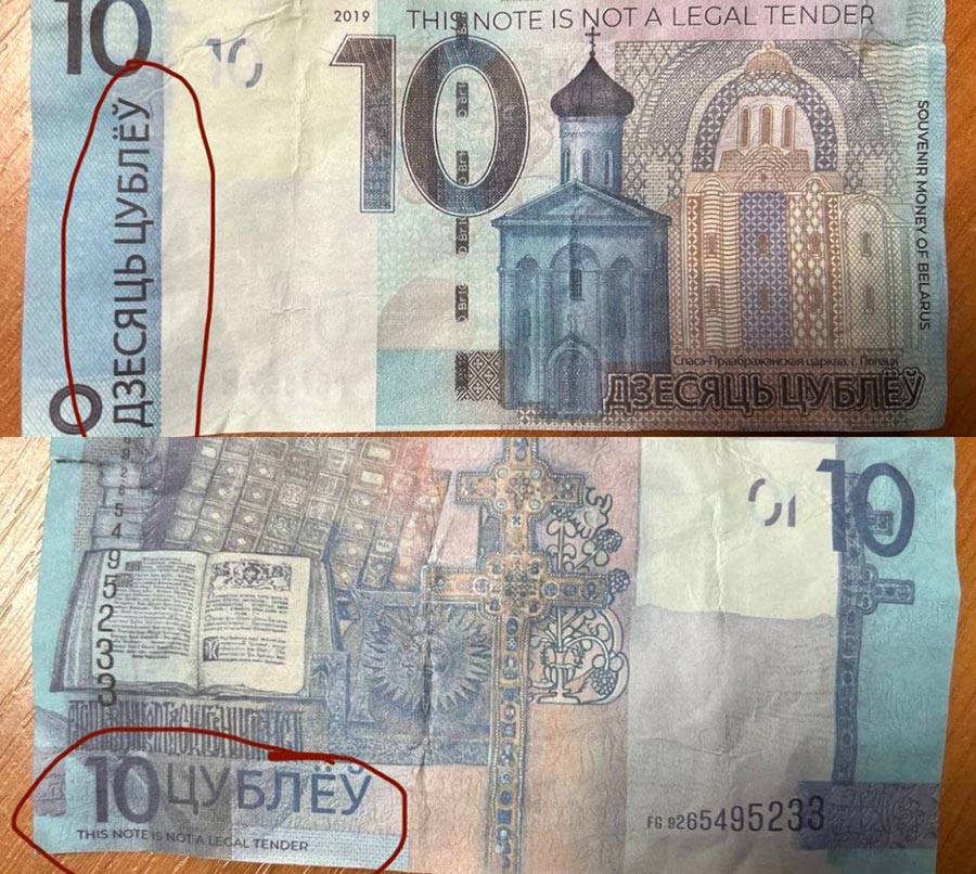 Такие "бумажки" есть в виде всех банкнот белорусских денежных знаков. Они соответствуют им по размеру, но имеют надписи "Дублёу", "Цублёу", Souvenir money of Belarus, "БIЛЕТ БАНКА ПРЫКОЛАУ", "Не является платежным средством" и прочие.