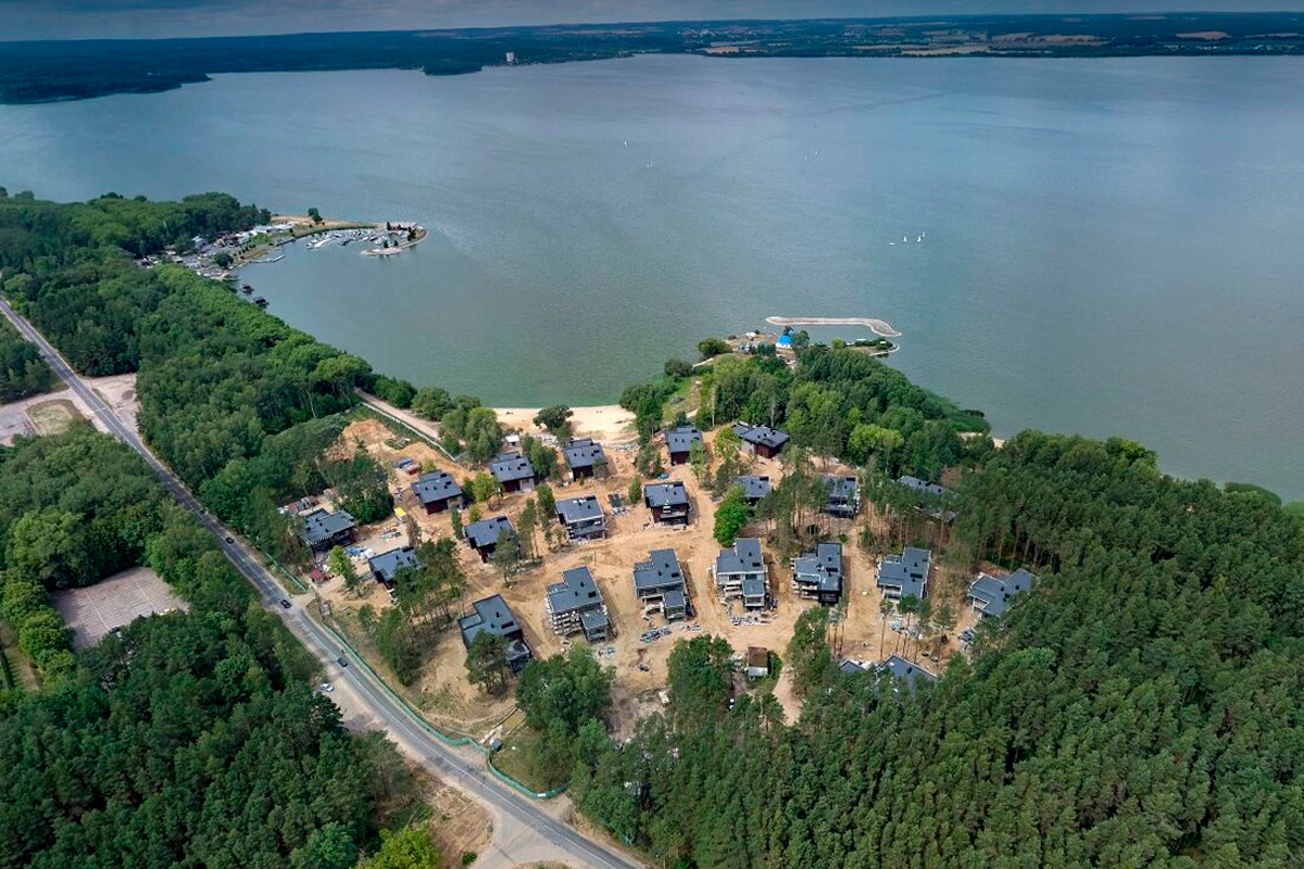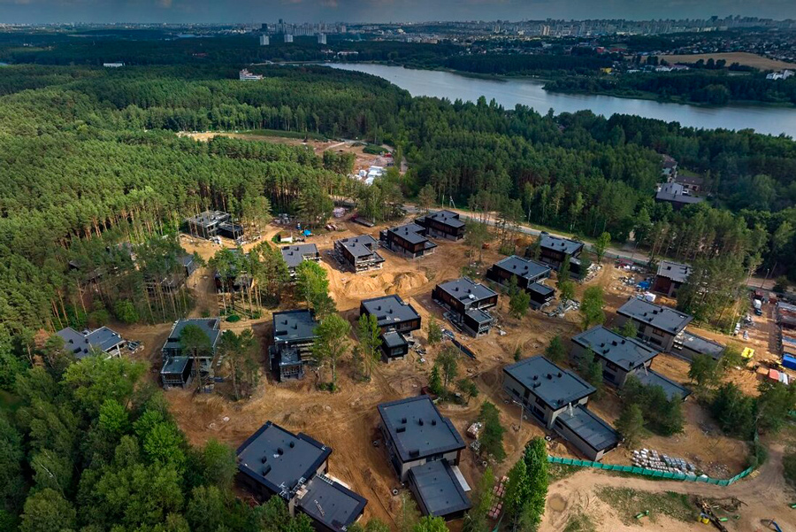 Часть комплекса, что ближе к деревне, еще строится, а вот квартал подороже (среди леса у берега Минского моря) уже готов.
