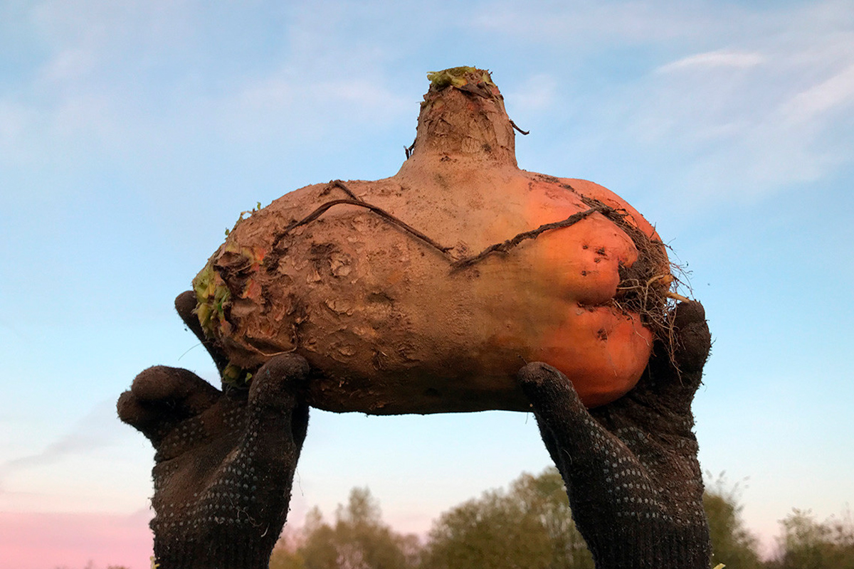 Мужчину ждал большой сюрприз. Евгений достал из земли очень необычную по форме сахарную свеклу. Напоминает она подводную лодку.