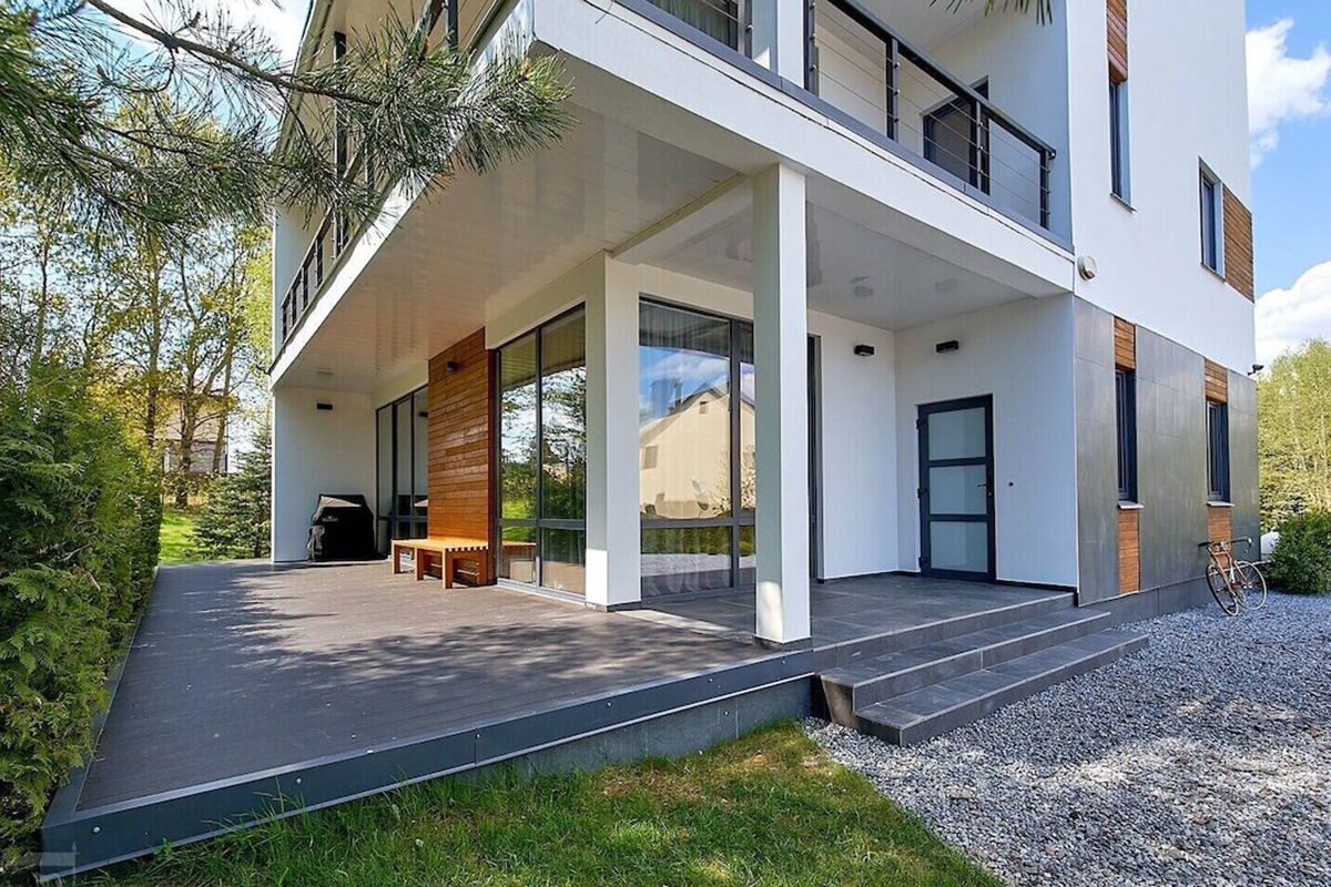 На первом уровне дома, построенного по проекту литовских архитекторов, находятся кухня-гостиная, холл с выходом на террасу, гостевая комната, санузел, тамбур и топочная.