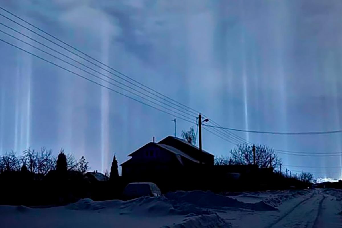 Когда свет от луны или фонарей преломляется в кристалликах снега, они образуют гало, что и создает светящиеся столбы или дуги. Чтобы этот эффект возник, нужны определенные погодные условия.