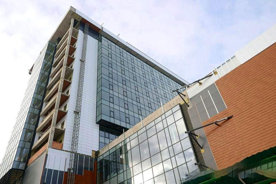 Внешне здание выглядит интересно, уже имеет завершенную форму. Строительные работы продолжаются, но больше – по части внутренней отделки. Сейчас идет монтаж огромного медиаэкрана.