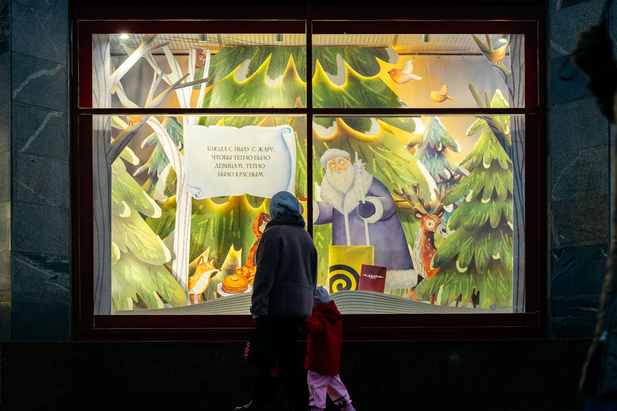 В восьми витринах ЦУМа расположились объемные книги, на их "страницах" и вокруг – герои и артефакты из сказок. Например, Емеля на печи и Щелкунчик с Машей с серебряным орешком в руке, а также другие новогодние персонажи и атрибуты – олени, пряничные домики, елки, подарки.