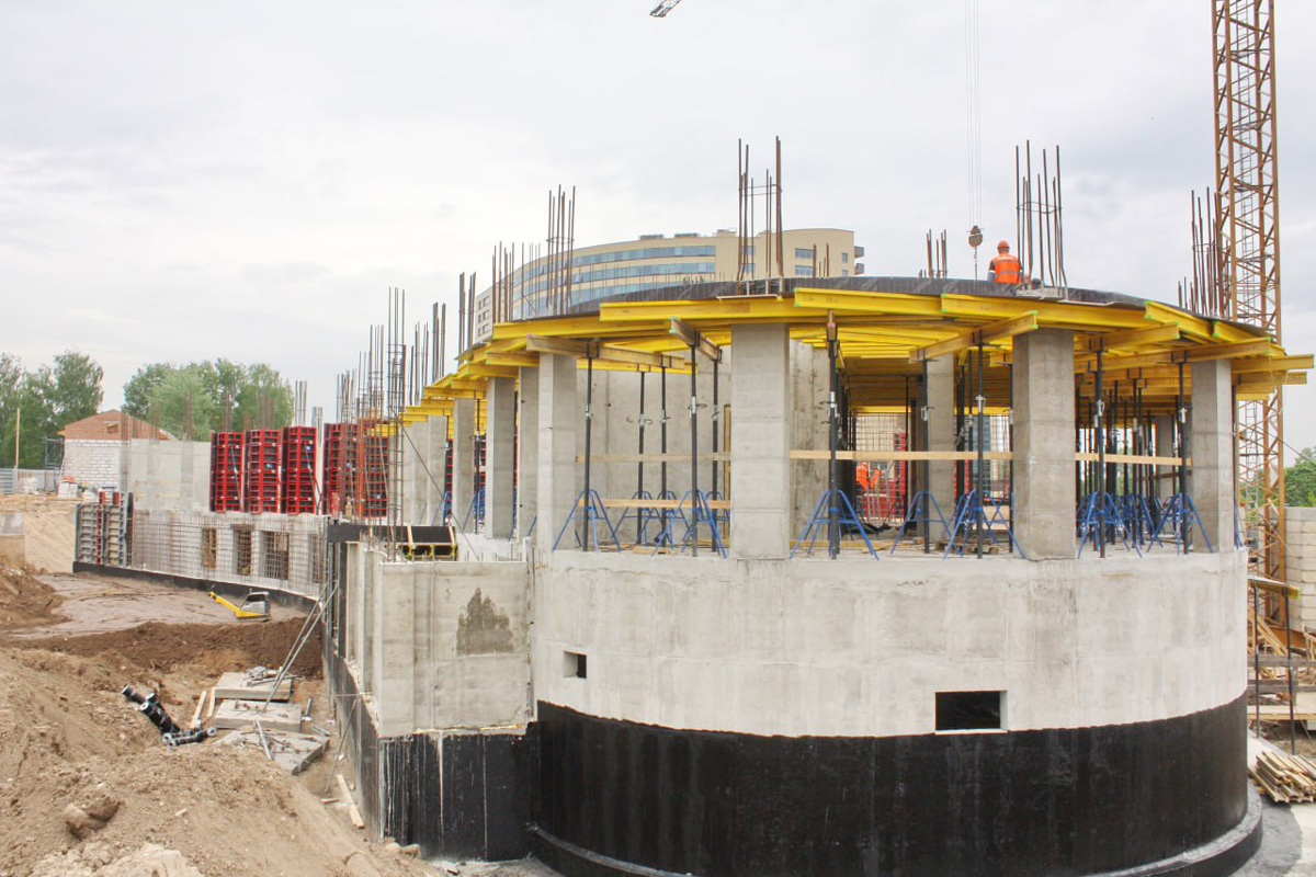 На свайном поле из 870 железобетонных опор уже выполнен монолит подвальной части, ведутся гидроизоляционные работы и обратная засыпка котлована. Монолитчики заливают плиту перекрытия над первым этажом.
