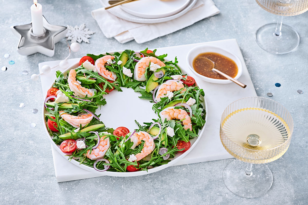 Приготовить сочный рождественский салат легче, чем кажется. Креветки обдаем кипятком и чистим. Авокадо (вместо него можно взять несладкие груши) режем крупными ломтиками, которые сбрызгиваем лимонным соком. Лук режем соломкой, обдаем кипятком.