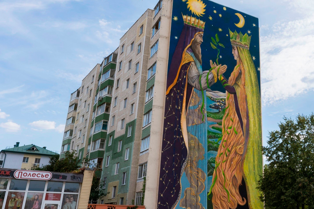 "За основу сюжета солигорского мурала взяты классические и общие для многих культур образы Отца-Неба и Матери-Земли. Отец-Небо – это верховный создатель порядка во вселенной, воплощение чистого дневного света и мудрости. <…> Мать-Земля – прародительница всего живого и наиболее почитаемый в мифологии женский образ", – рассказали в пресс-службе.