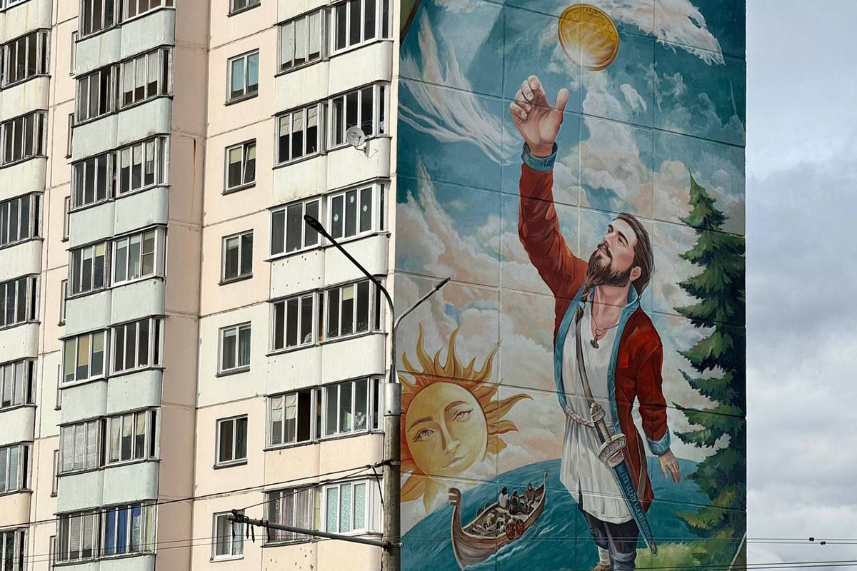 В Витебске появился экомурал, аналогов которому нет в Беларуси. Огромное изображение с древнебелорусскими мотивами можно увидеть на фасаде жилого десятиэтажного дома по улице Воинов-Интернационалистов, 12, корпус 2.