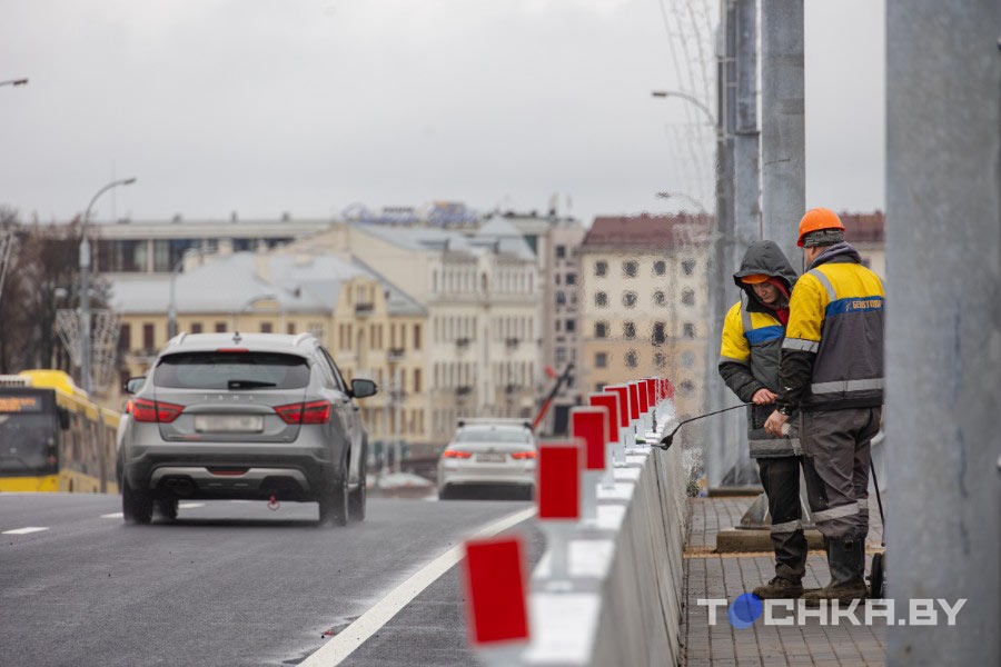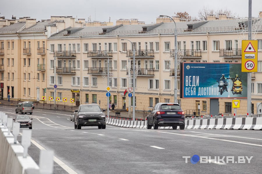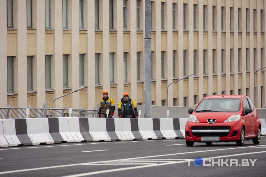 Накануне открытия путепровода директор ГП "Гордорстрой" Сергей Панев рассказал, что мост на пр. Независимости успешно прошел испытания на нормативную нагрузку. По нему одновременно ездили девять МАЗов с 30-тонным грузом.
