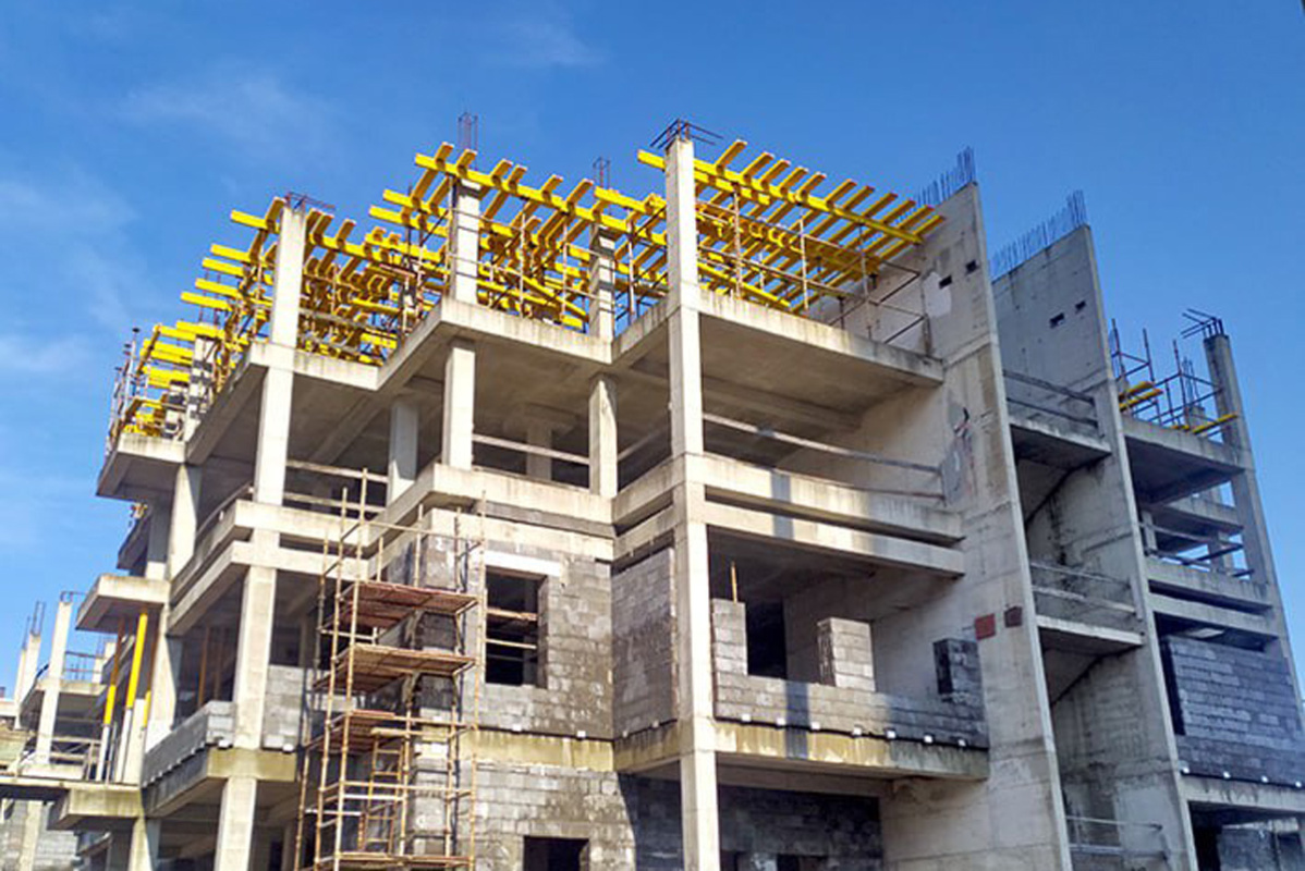 Основные работы сейчас ведутся на третьей секции здания: каменщики выполняют кладку наружных стен из керамзитобетонных блоков, а монолитчики готовятся заливать плиту перекрытия последнего, пятого этажа.