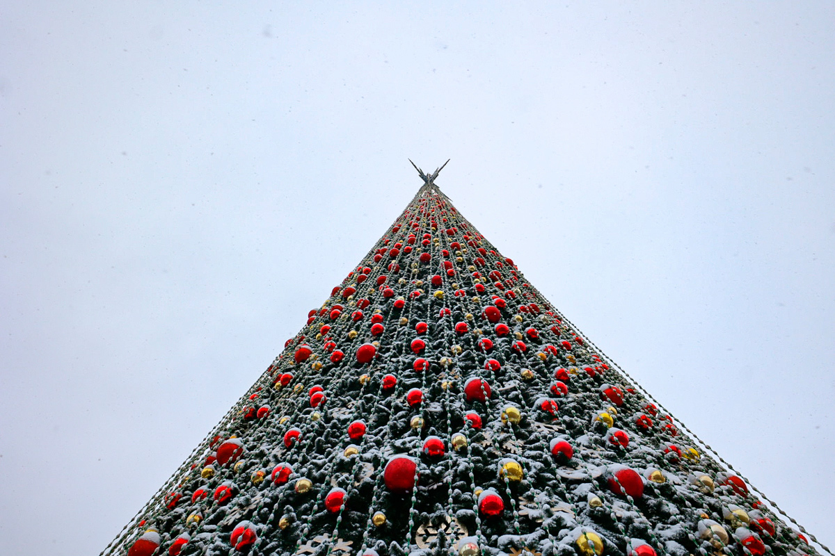 Цветовую гамму выбрали максимально традиционной: красно-золотую. По высоте ель "перещеголяла" все расположенные рядом здания, в том числе и Дворец Республики.