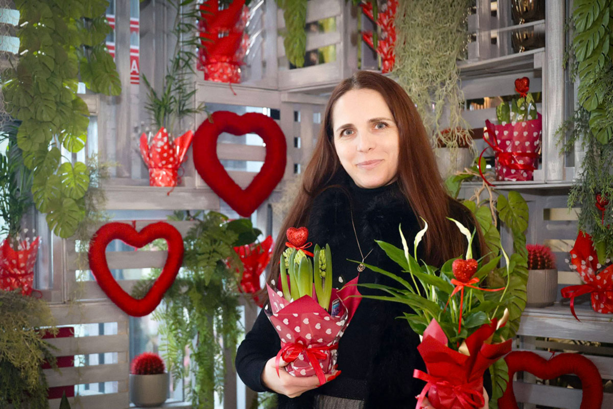 Для тех, кому не нравятся со временем увядающие букеты, в магазине предлагают прекрасный вариант из луковичных цветов в горшочках. И подставочка в форме сердца, и ленточки-бантики, и пламенные сердечки – весь антураж амурного праздника на месте. А когда придет время снять валентинки, на окне вашей любимой останется прекрасный цветок, который будет радовать ее долгие месяцы, а то и годы.