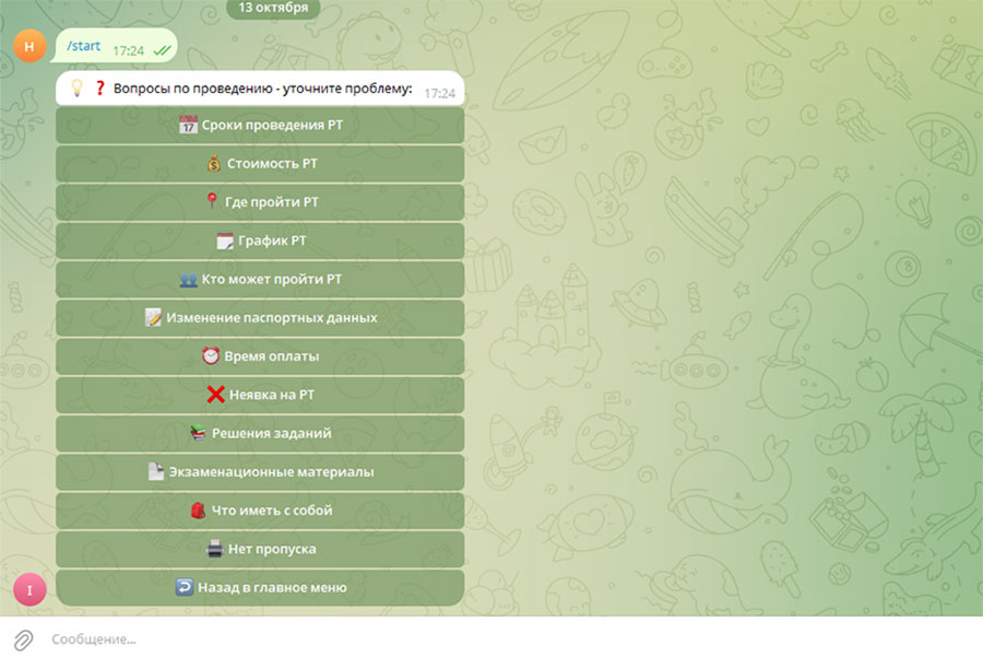 Начальное меню состоит из четырех разделов. Но вопросов, которые охватит чат-бот, намного больше.