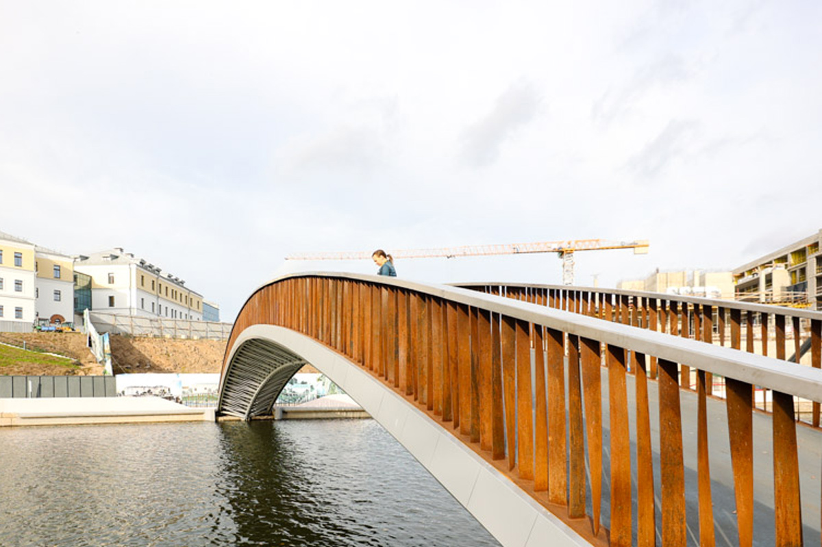 Перила моста поддерживает якобы "ржавое" ограждение. На деле же это кортеновская сталь. Такой материал не красят и не защищают дополнительно, он не подвержен коррозии. Там, где используется эта сталь, не остается разводов и подтеков.