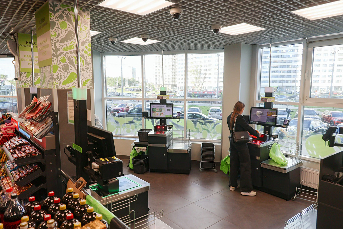 Покупателям доступны пять касс самообслуживания со сканерами, где можно расплатиться банковской картой, смартфоном или умными часами.