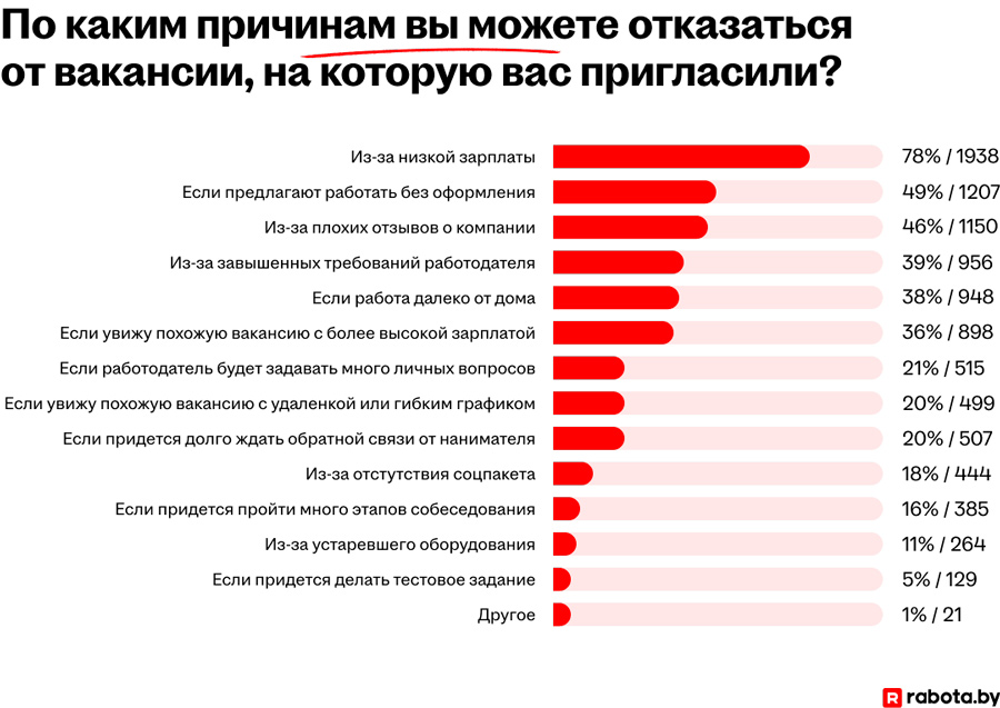 Кроме нее, важными пунктами для респондентов стали трудоустройство без оформления и плохие отзывы о компании.