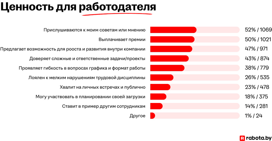 Лидером среди ответов на вопрос "По каким признакам вы ощущаете свою ценность для работодателя?" стал пункт о повышении заработной платы.