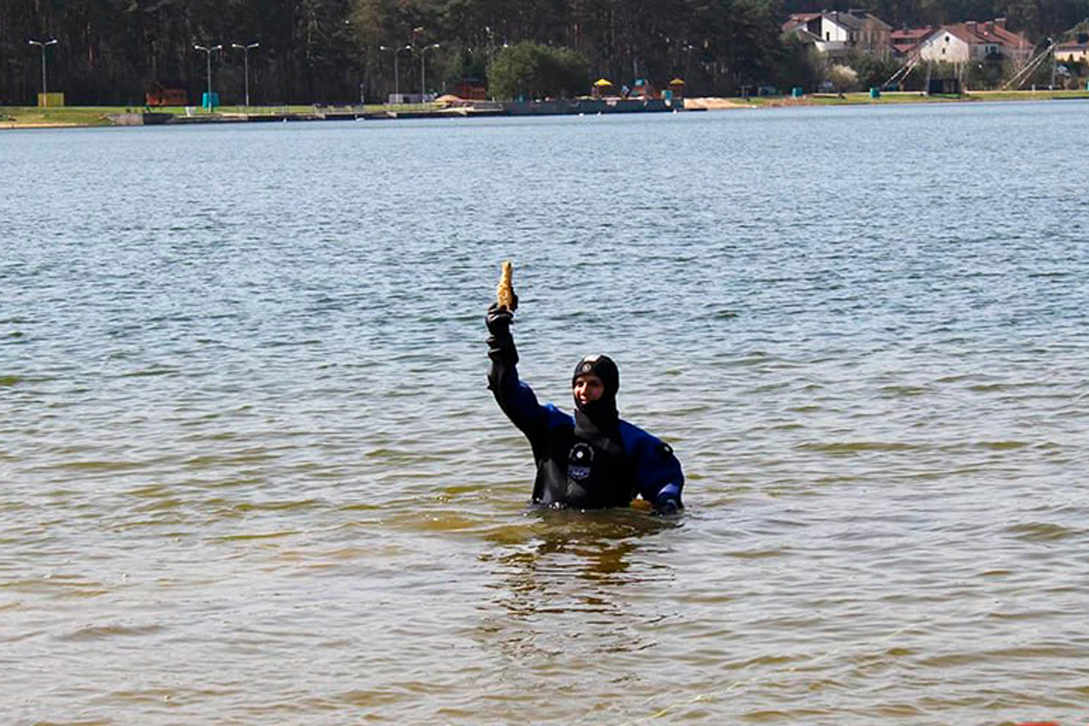 Под воду спустился начальник Борисовской спасательной станции Евгений Михнюк. Несколько минут – и он насобирал целую сумку "добра".