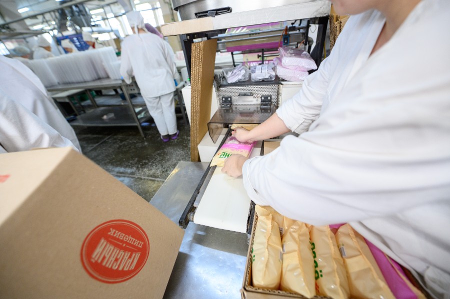 Затем робот упаковывает их в термоусадочную пленку и аккуратно складывает на паллеты. Готовая продукция поступает на склад, а потом – в магазины "Евроторга".