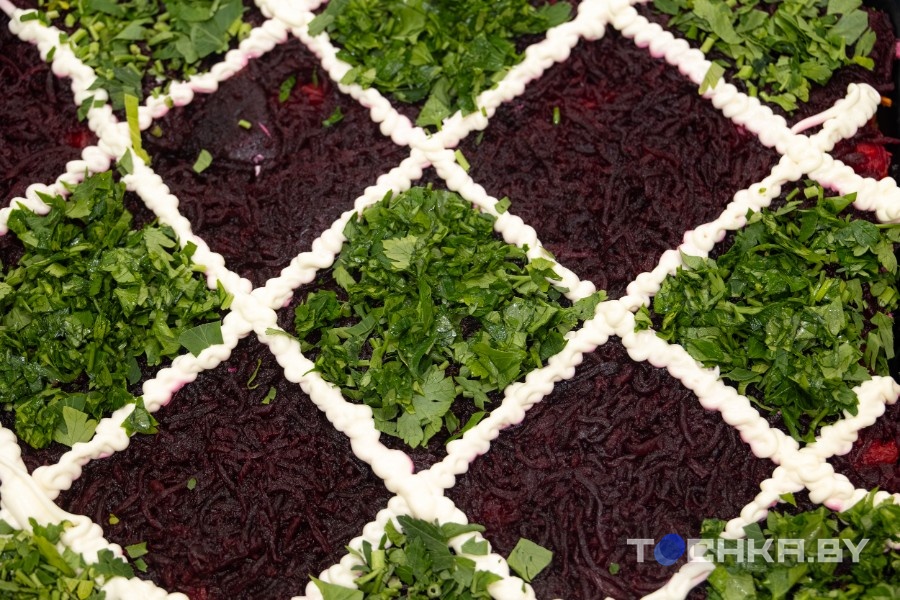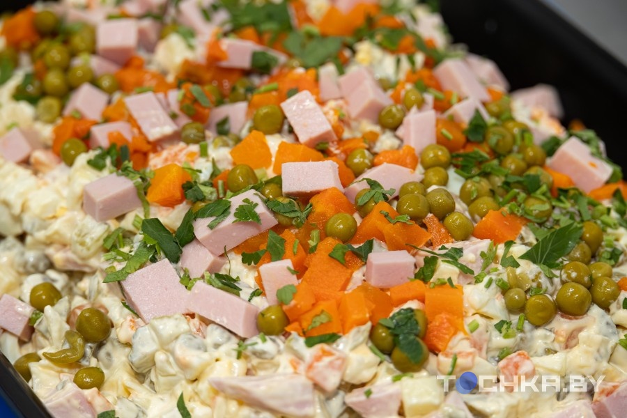 Старый Новый год сложно представить без классики. Сельдь под шубой из кулинарии стоит Br17,99 за кило, а овощной салат с колбасой – Br16,49. Выглядит все очень достойно.