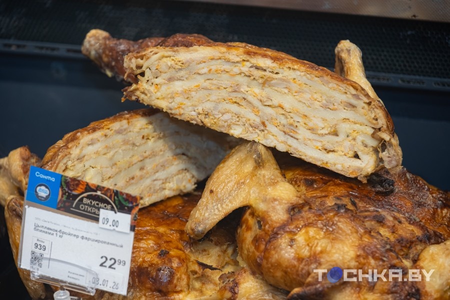 Готовый цыпленок-бройлер, фаршированный блинами, в кулинарии стоит Br22,99 за кило.