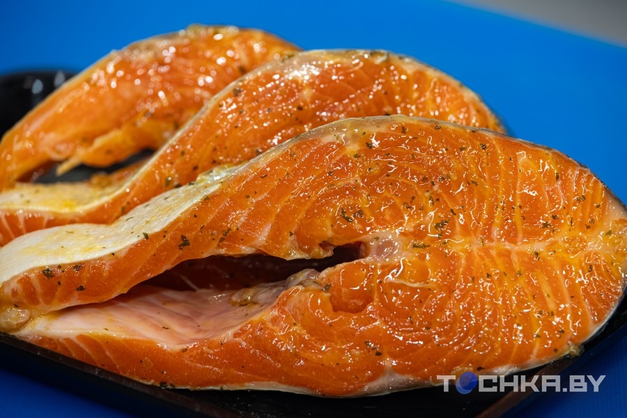 Куда же без красной рыбы? Можно выбрать охлажденный стейк из форели, уже в маринаде "Кавказский", – Br69,99 за кило. Рыбу не нужно чистить и разделывать – достаточно выложить на противень и просто запечь.