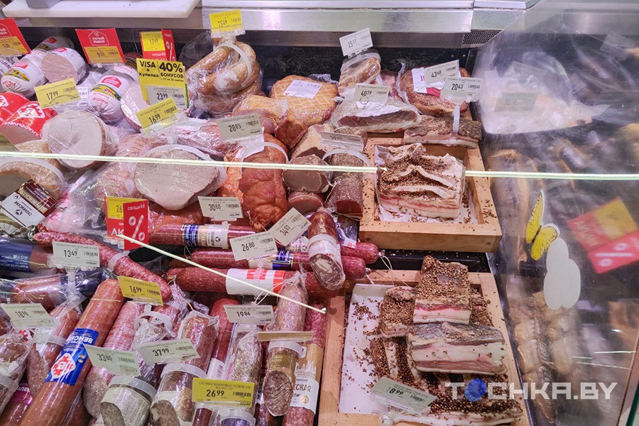 К примеру, в "Короне" в колбасном отделе есть и сало. Некоторые кусочки выглядели, на наш взгляд, подсохшими. Цены такие: Br17,64–29,9 за кг.