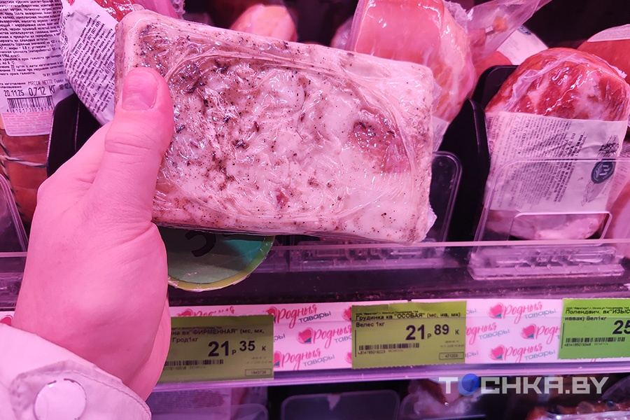 В "Соседях" в мясном отделе была только грудинка. Мы ее не учитываем. В вакуумной упаковке – два варианта сала по Br25,99 и Br29,55. Что подешевле выглядело ничего так, подороже – показалось неаппетитным.