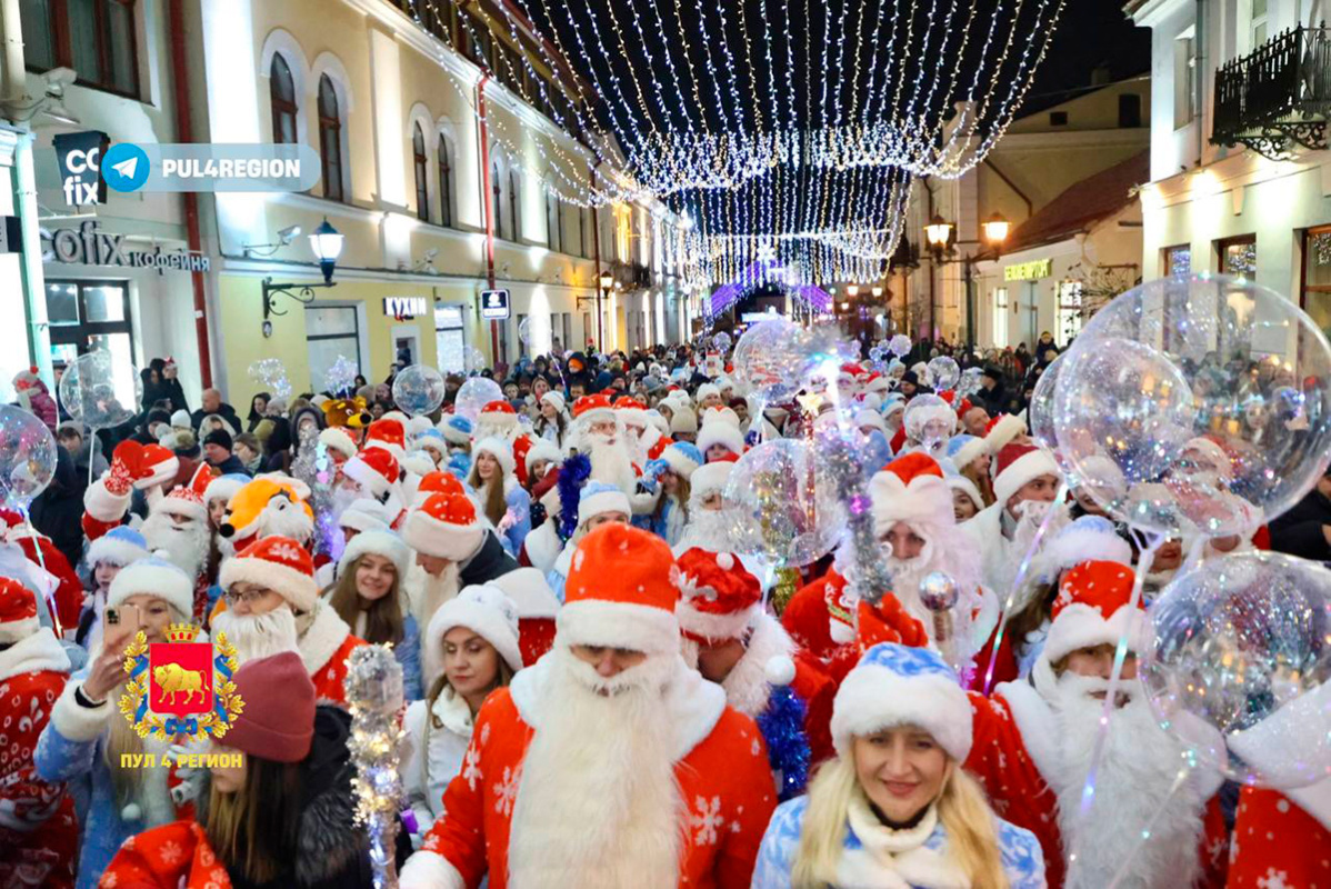 В пятницу, 15 декабря, в Гродно прошел парад Дедов Морозов и Снегурочек, сообщает Telegram-канал "Пул 4 Регион".
