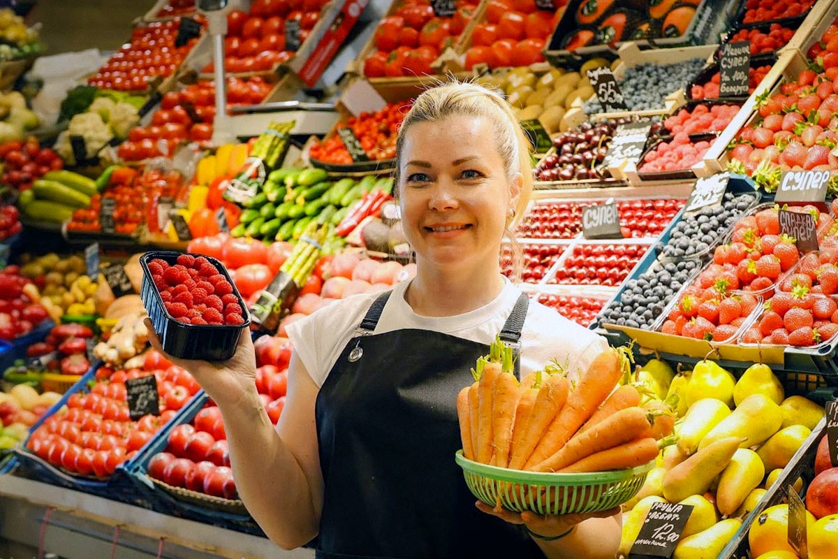Отборные томаты, как белорусские, так и привозные, много фермерских огурцов, чеснок и лук, множество самой разнообразной зелени. Конечно, в канун лета нельзя обойтись и без свежих ягод. Хотите отведать белорусской малины? Пожалуйста! Есть клубника, есть голубика. А любителям экзотики – медовое манго.
