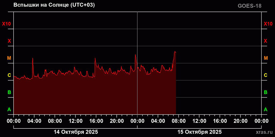 В ночь на 15 октября 2025 года на Солнце зафиксирована одна из самых мощных за последние несколько месяцев вспышек, и это еще не предел, рассказали в пресс-службе Лаборатории солнечной астрономии ИКИ РАН.