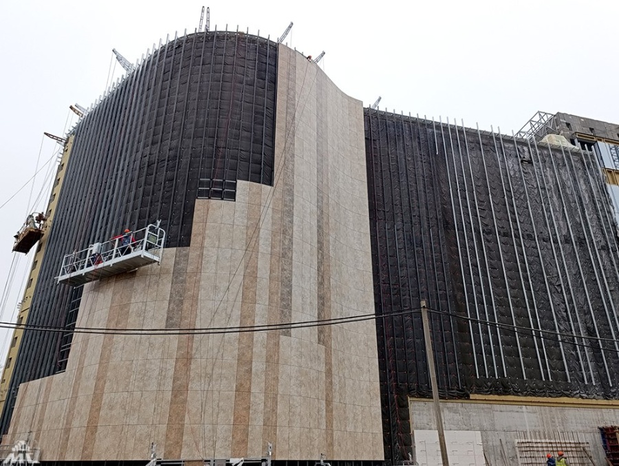Фасадчики тоже не отстают – уже наполовину утеплили здание, облицовывают его керамогранитом и монтируют витражи. Ведутся и кровельные работы.