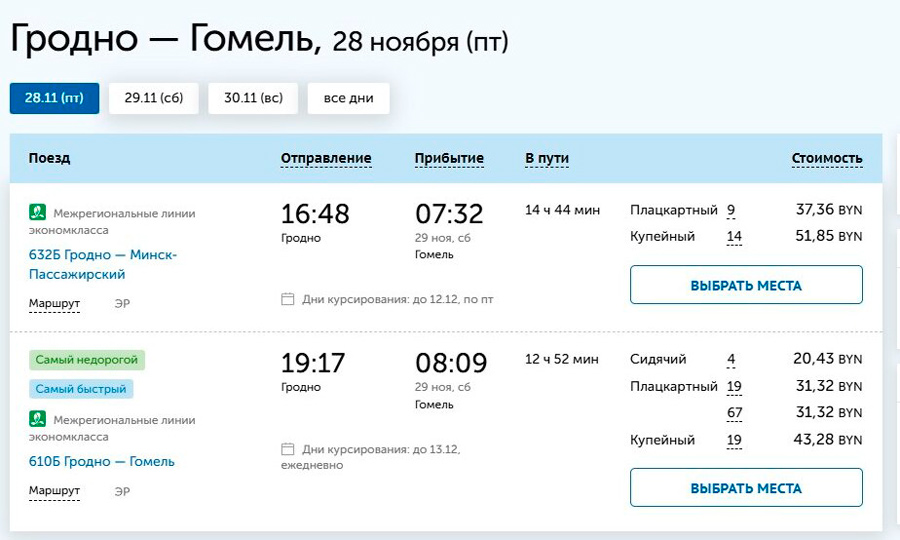 Самый дешевый сидячий билет обойдется в Br20,4, а время в пути составит почти 13 часов. Другой поезд едет и того дольше – почти 15 часов.
