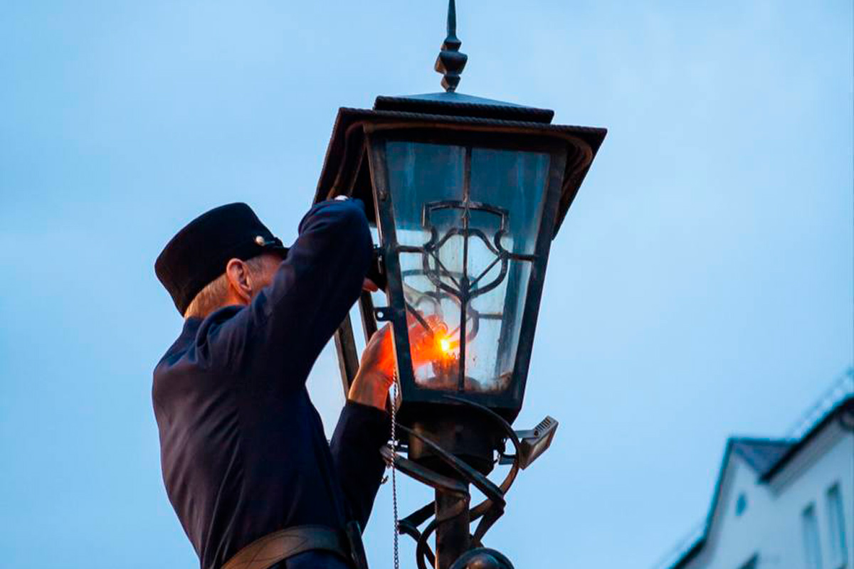 Статный мужчина в форме петровских времен зажигает и гасит фонари с 2009-го. Для совершения ритуала он поднимается по лестнице и вручную "дает свет" в керосиновой лампе.