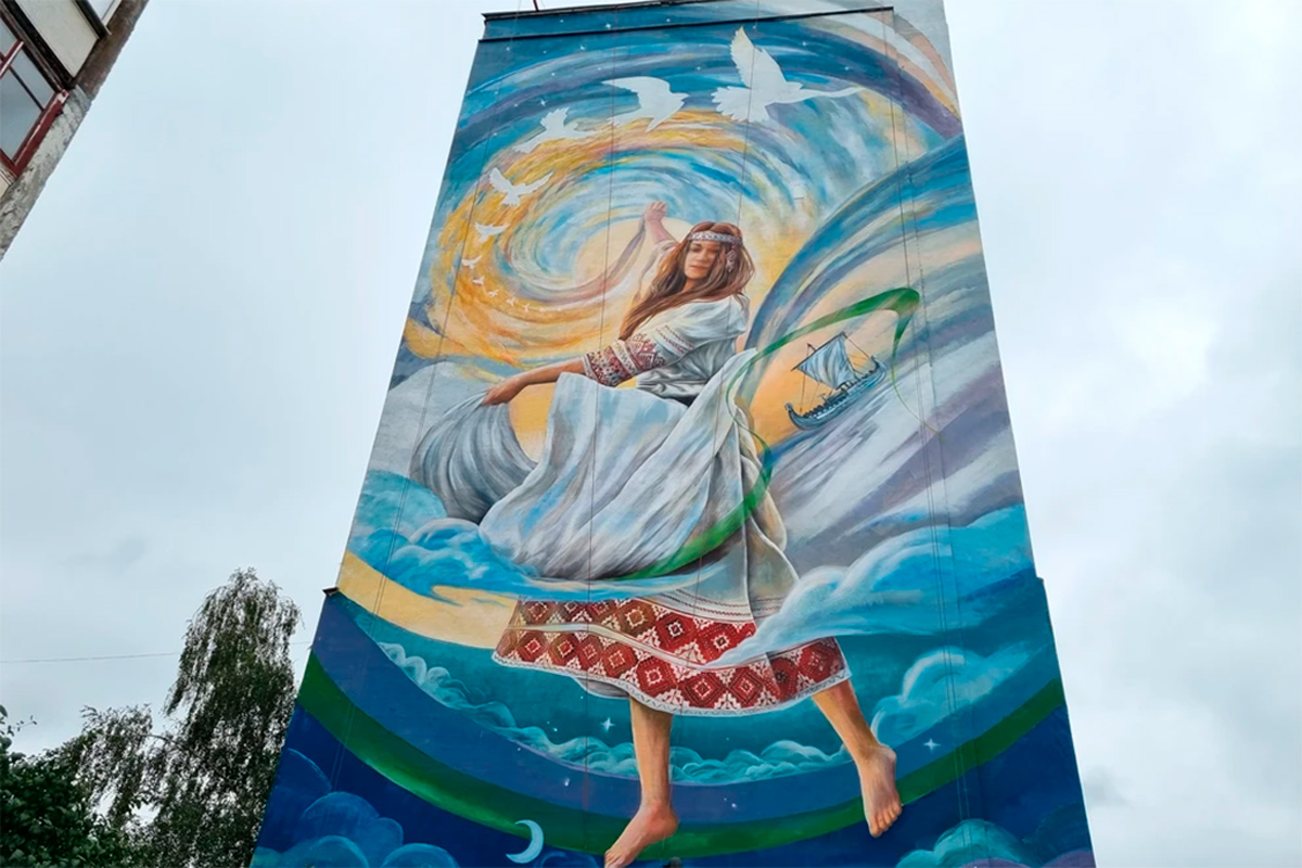 Изображение во всю высоту девятиэтажного дома можно увидеть на одном из жилых зданий на улице Московской. В центре сюжета молодая белорусочка в национальном костюме. Над ней витают голуби, а около ног нарисованы достопримечательности Брестчины.