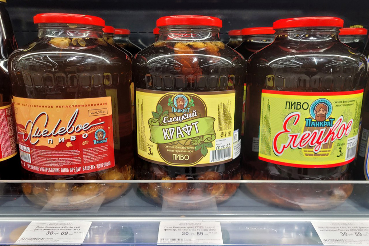 К примеру, в минском супермаркете могилевской сети "Перекресток" на выбор предлагают три варианта напитка в стеклянной баклажке и с шишками хмеля внутри – "Хмелевое пиво", "Елецкое" и "Елецкий крафт".