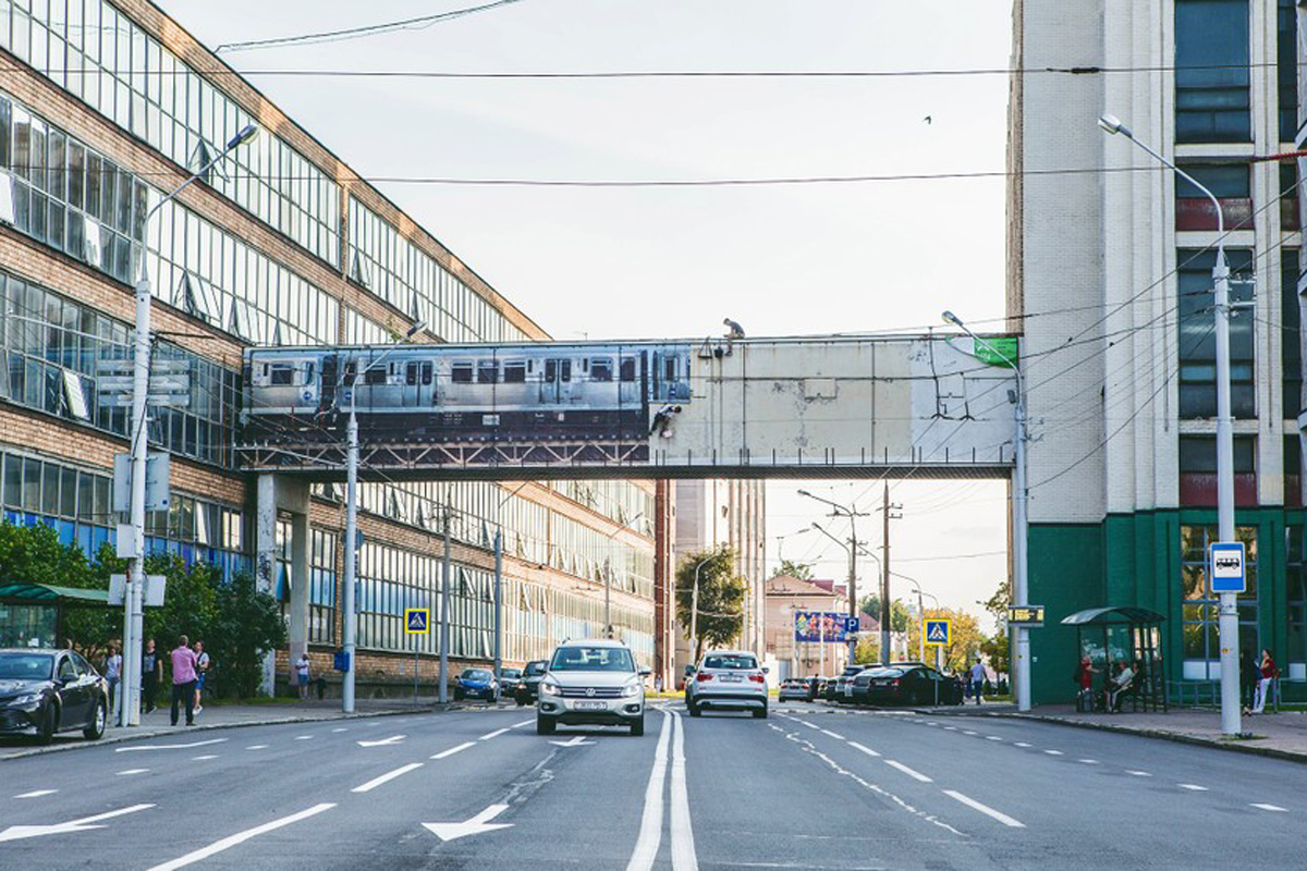 Стрит-арт-объект был создан художником Андреем Буслом в рамках фестиваля Vulica Brasil в 2019 году. Над оживленной улицей Куйбышева раньше "проезжал" поезд: мурал был нарисован на переходной галерее, соединяющей заводские корпуса.