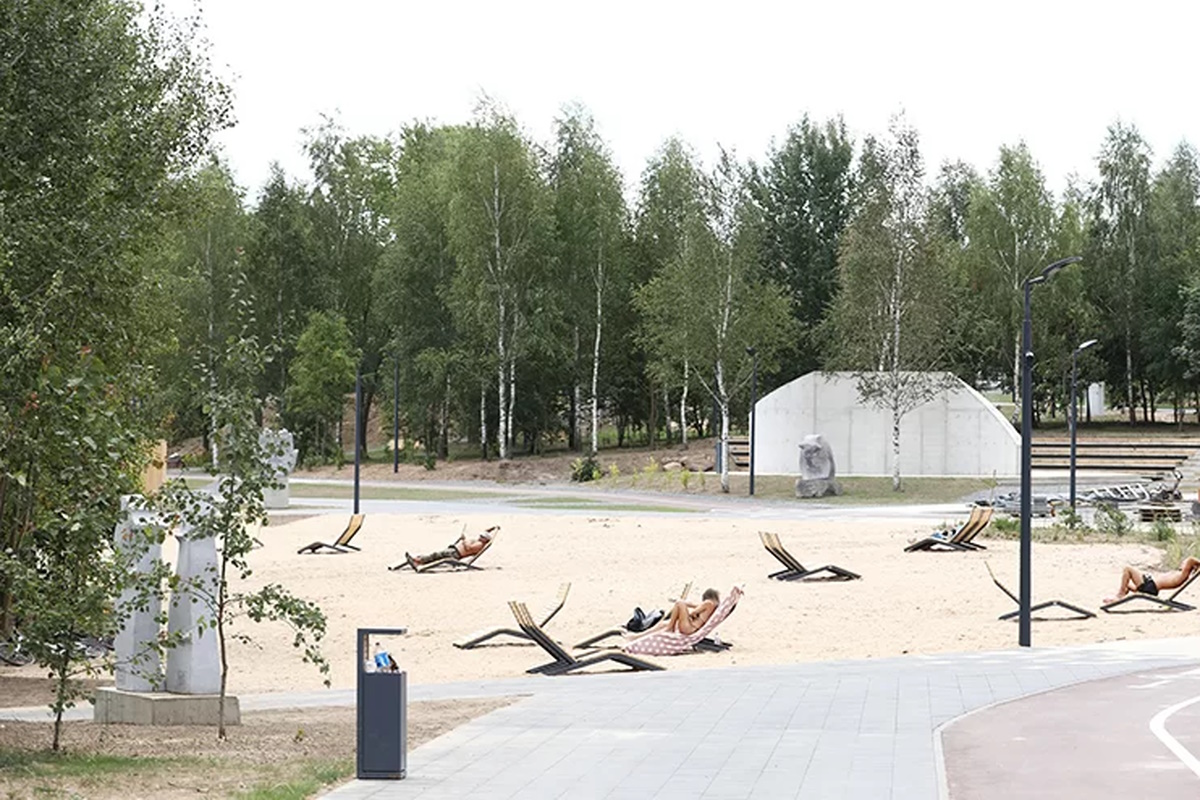 На новых лежаках загорают люди, велосипедисты осваивают новые прогулочные маршруты, а на баскетбольной площадке слышен веселый шум "дворового" матча.