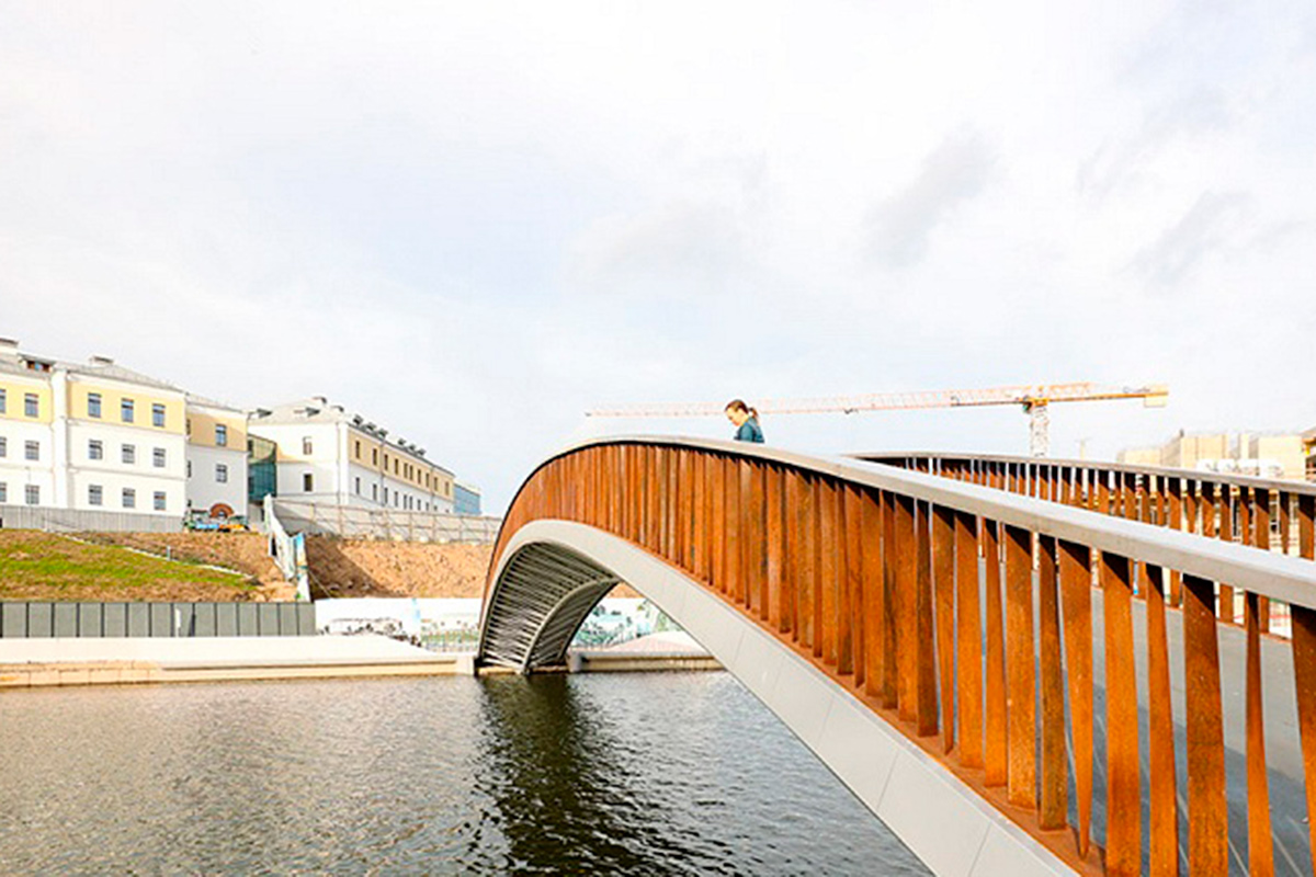 Перила моста поддерживает якобы "ржавое" ограждение. На деле же это кортеновская сталь. Такой материал не красят и не защищают дополнительно, он не подвержен коррозии. Там, где используется эта сталь, не остается разводов и подтеков. В общем, "ржавчина" – это декоративный элемент, любимый многими архитекторами в разных странах мира.