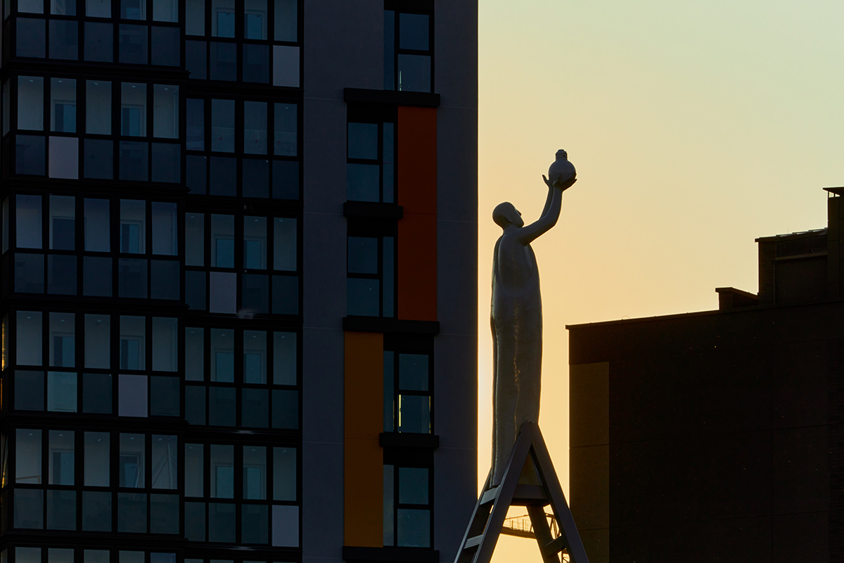 "Это простой и знакомый персонаж, человек, которого не заподозришь в пафосе. Он завинчивает лапочку в небо. Таким образом небо становится также действующим персонажем этой композиции. И тема обновления, когда одно меняем на другое – это тоже очень важно", – размышляет скульптор, глядя на свою работу.