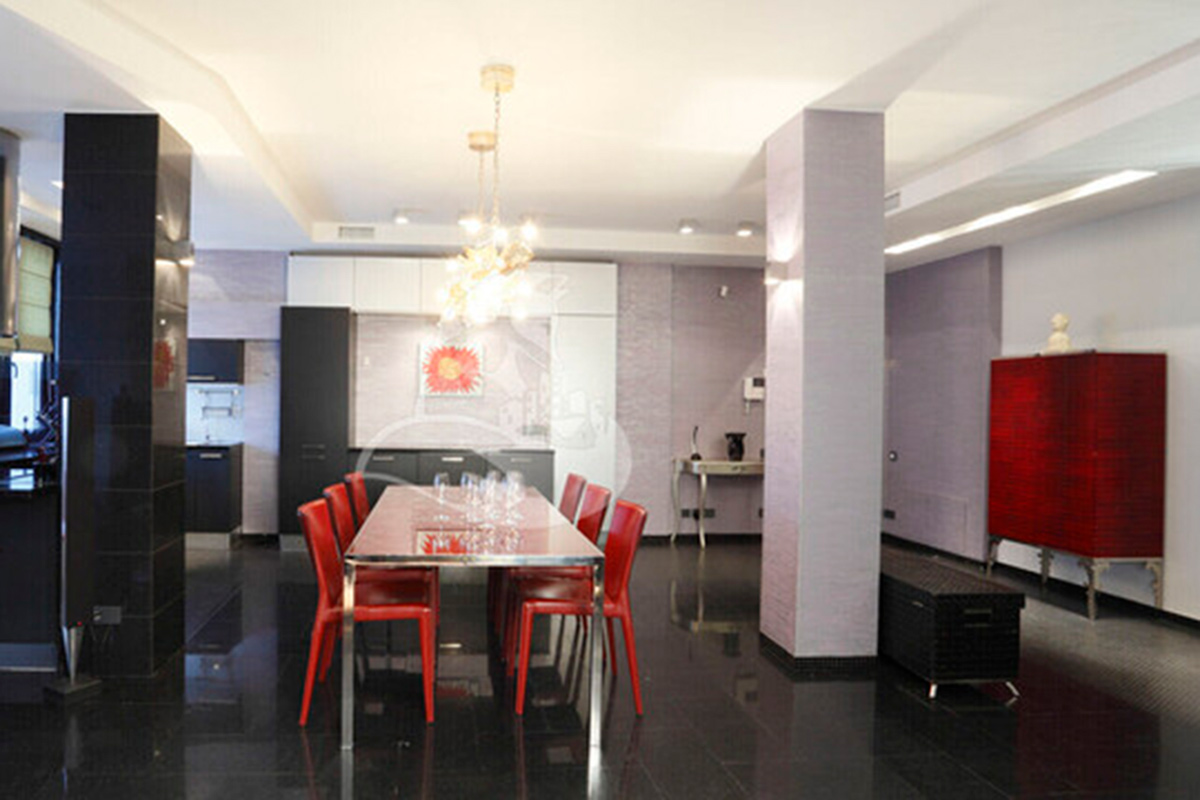 Кухня просторная – почти 20 квадратных метров. Ее фишка – красный шкаф для хранения посуды и бокалов, выполненный из кожи крокодила.