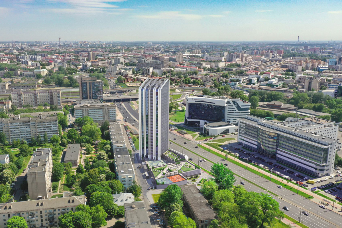 Комплекс из 23-этажей достраивают на проспекте Дзержинского напротив отеля "Ренессанс". Весной был готов каркас из прочного железобетона, после чего бригады занялись панорамным остеклением. Фасадные работы должны завершить до конца лета.