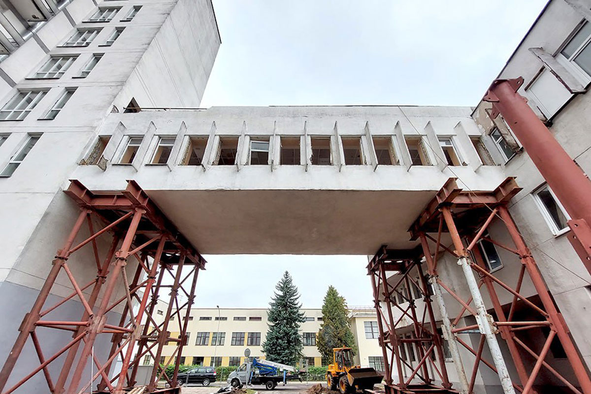 Будут демонтированы подвальная часть и переходная галерея, для безопасного сноса которой строители сейчас устанавливают поддерживающие металлоконструкции.
