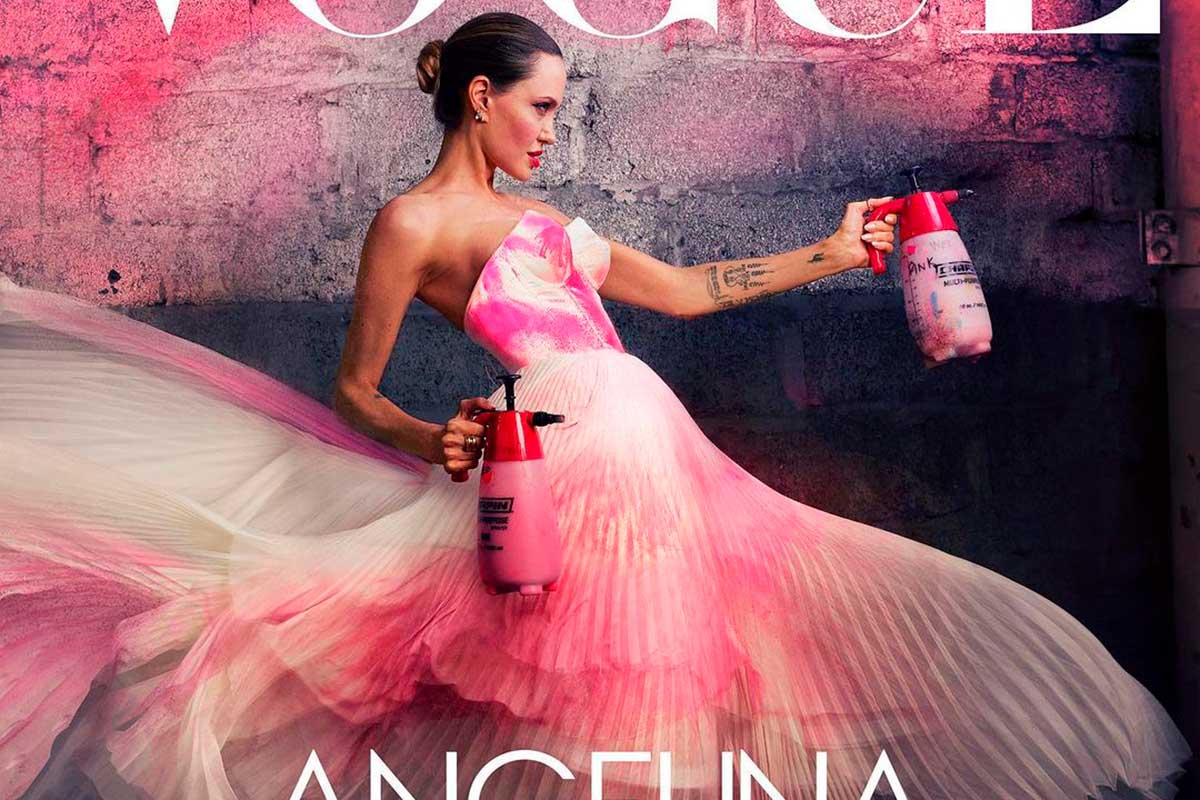 На обложке Джоли позирует в пышном, белом платье с "выпачканным" розовым принтом и галлонами краски. То ли дань тренду барбикор и фильму "Баррби", то ли модная ссылка на активистов Just Stop Oil, которые взяли моду портить произведения искусства.