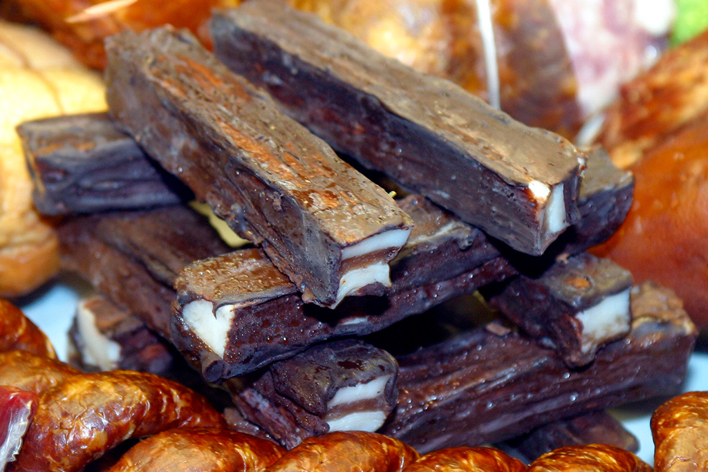 Брусок белого сала на шпажке обжариваем в сковородке на масле со всех сторон. Добавляем свежий чеснок и острые перцы целиком. После того, как сало обжарено до золотистой корочки, его нужно обмакнуть в топленый шоколад, а затем обвалять в арахисе.