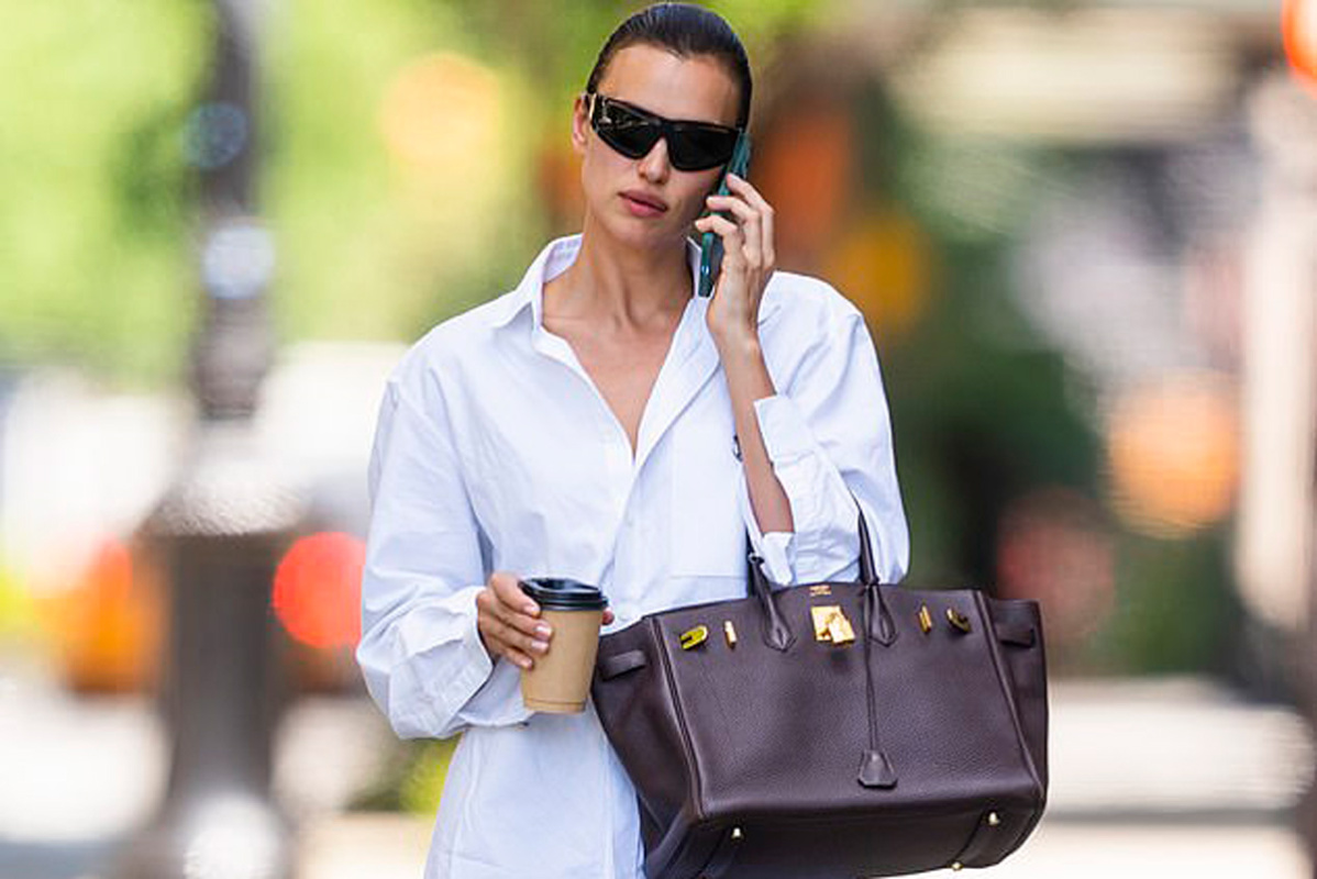 Сама Шейк выгуливает старый-добрый тренд с прямыми брюками и лоферами. Главный лайфхак от модели: классический образ можно и нужно разбавлять правильными аксессуарами. Например, кожаной сумкой с оригинальной отделкой. В случае Ирины – это Hermes Birkin.