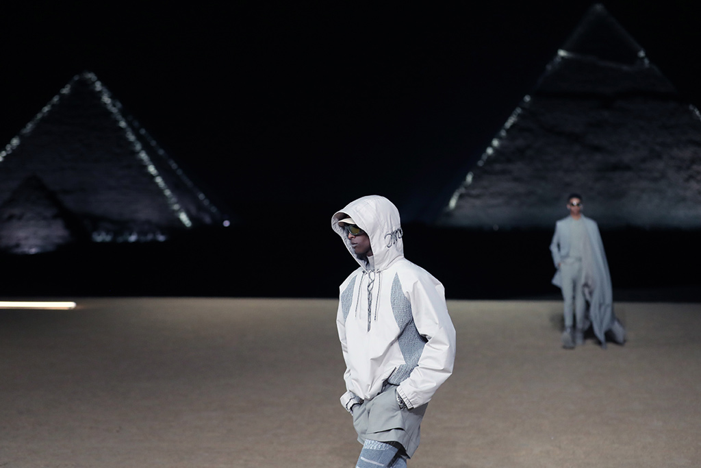 На фоне пирамид модный дом представил футуристическую мужскую коллекцию осень-2023 под названием Celestial. Дело было вечером, в свете софитов это смотрелось действительно фантастически.