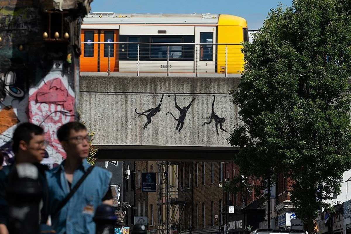 Новая работа творца украсила улицу Брик-Лейн. На граффити изображены три обезьяны, качающиеся на железнодорожном мосту.