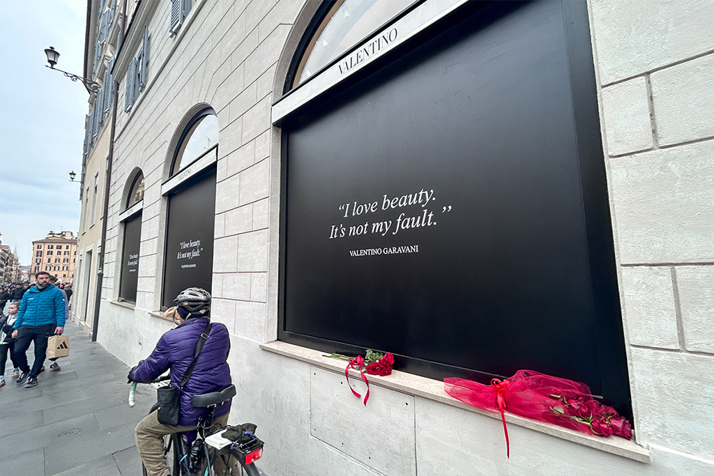 Донателла появилась на публике в красном брючном костюме, отсылающем к любимому цвету Валентино, а в витринах и окнах бутиков бренда по всему городу появилась знаменитая цитата модельера: "Я люблю красоту. Это не моя вина".